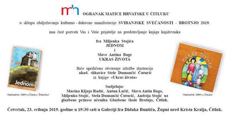 U četvrtak 23. svibnja 2019. u Galeriji fra Didaka Buntića u Čitluku s početkom u 19:30 sati bit će predstavljanje zbirke pjesama fra Miljenka Stojića „Jednom“ i knjige Slave Antina Bage „Ukras života“.
